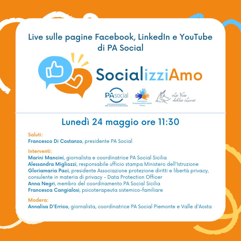 Il 24 maggio scorso, live sulle pagine Facebook, LinkedIn e sul canale YouTube di PA Social, è stato ufficialmente presentato SocializziAmo, il progetto di informazione visiva per un uso corretto e consapevole dei social network da parte dei minori.